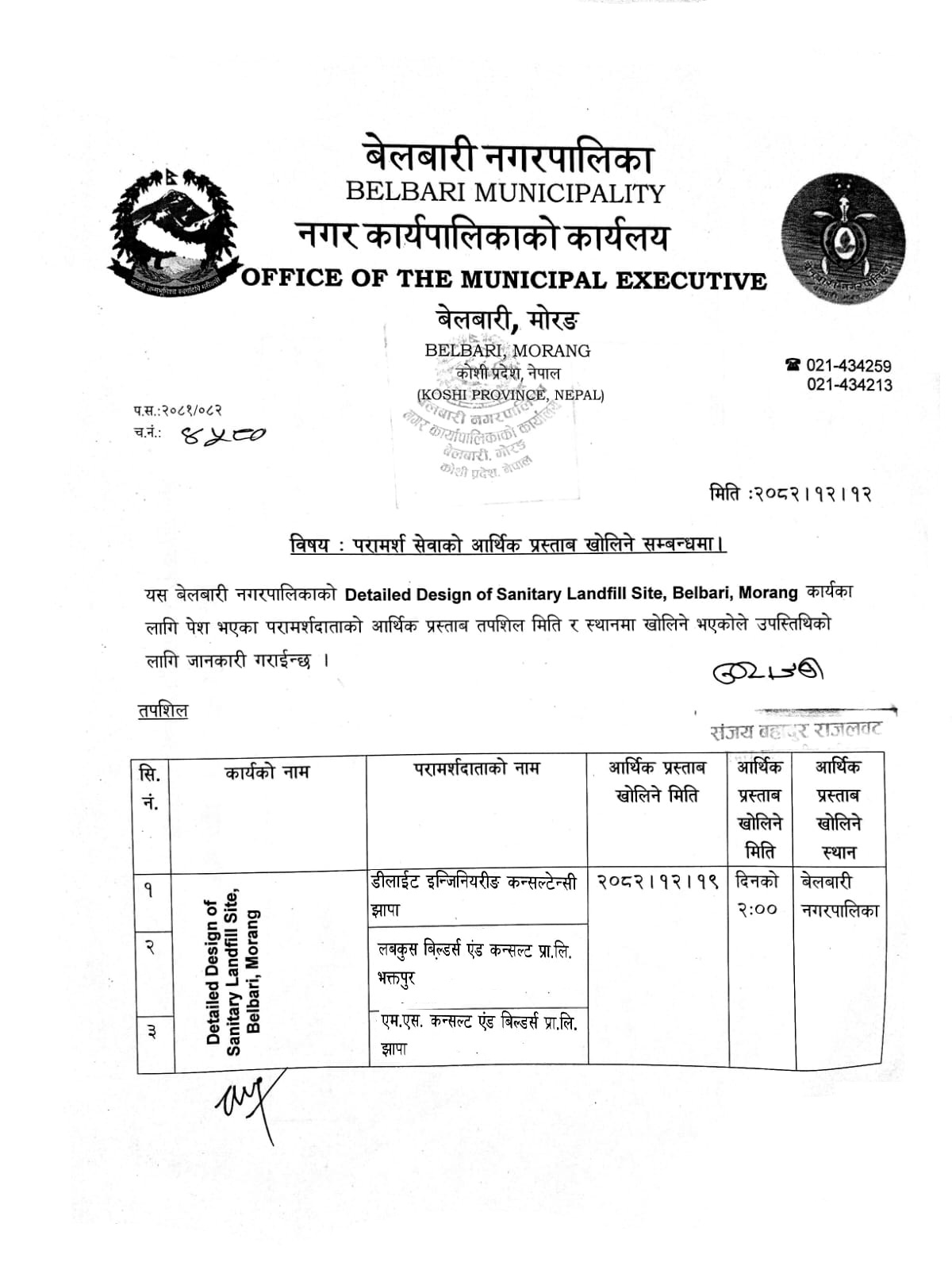 परामर्श सेवाको आर्थिक प्रस्ताब खोलिने सम्बन्धमा । Details Design of Sanitary landfill site
