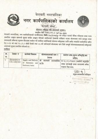 » Supply and Delivery of Stationery and Stationery items को बोलपत्र स्वीकृत गर्ने आषयको सूचना ।