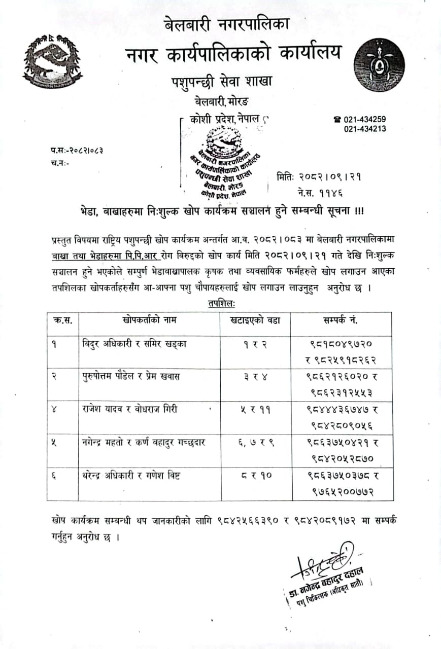 » बाख्राहरूमा निःशुल्क खोप कार्याक्रम सञ्चालन हुने सम्बन्धी सूचना ।