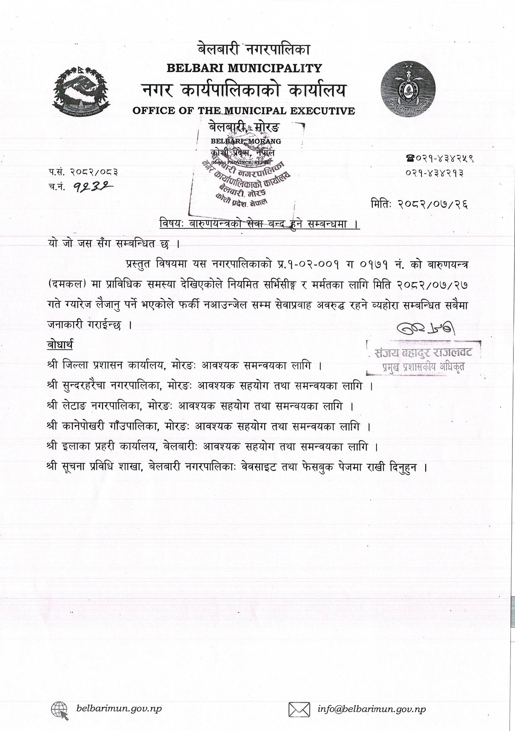 बारूणयन्त्रको सेवा बन्द हुने सम्बन्धमा । मिति २०८२।०७।२६