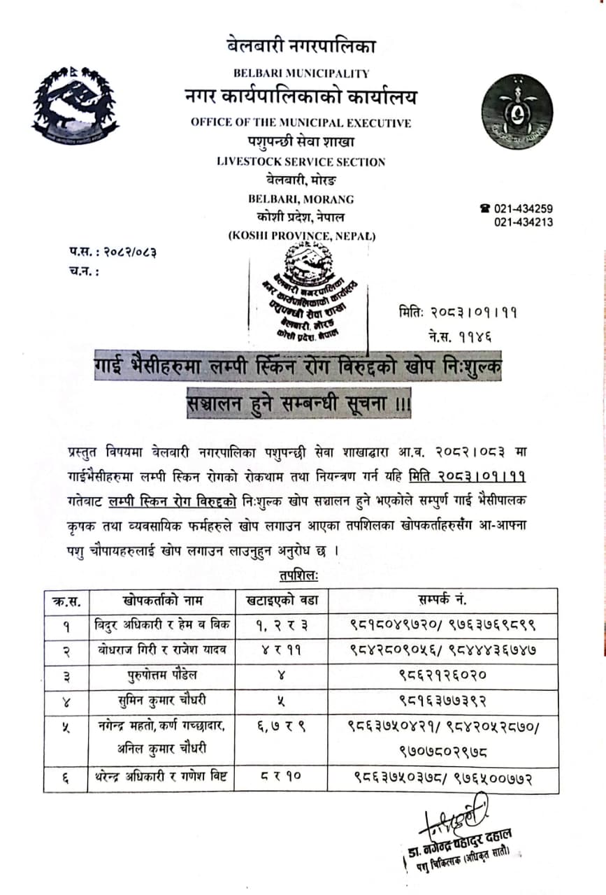 गाई भैसीहरूमा लम्पी स्किन रोग विरूद्धको खोप निःशुल्क सञ्चालन हुने सम्बन्धी सूचना ।