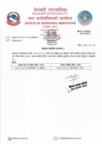 श्री अध्यक्षज्यू वडा कार्यालय सबै बेलबारी नगरपालिका जानकारी सम्बन्धमा ।