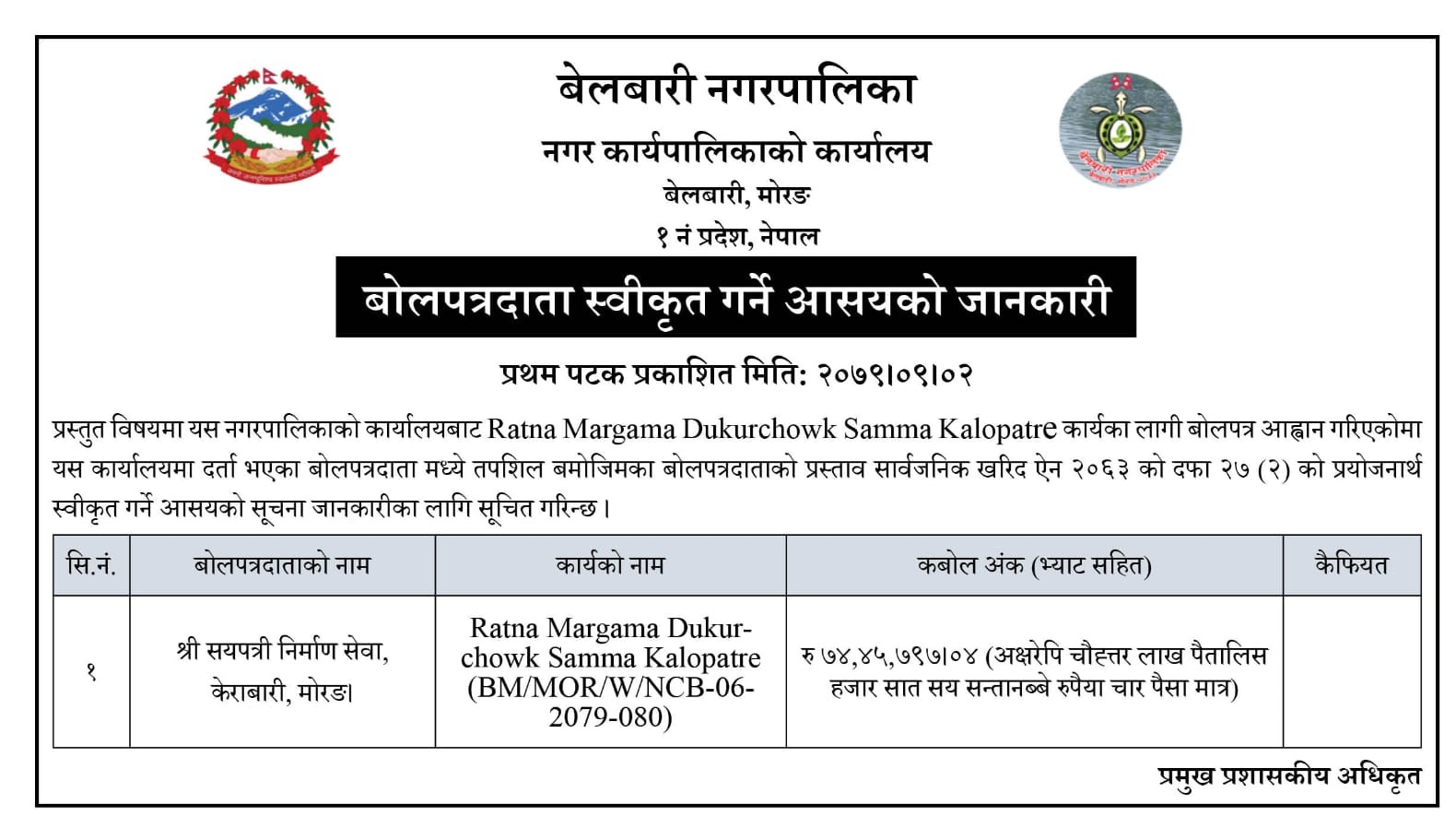 बोलपत्रदाता स्विकृत गर्ने आशयको जानकारी।