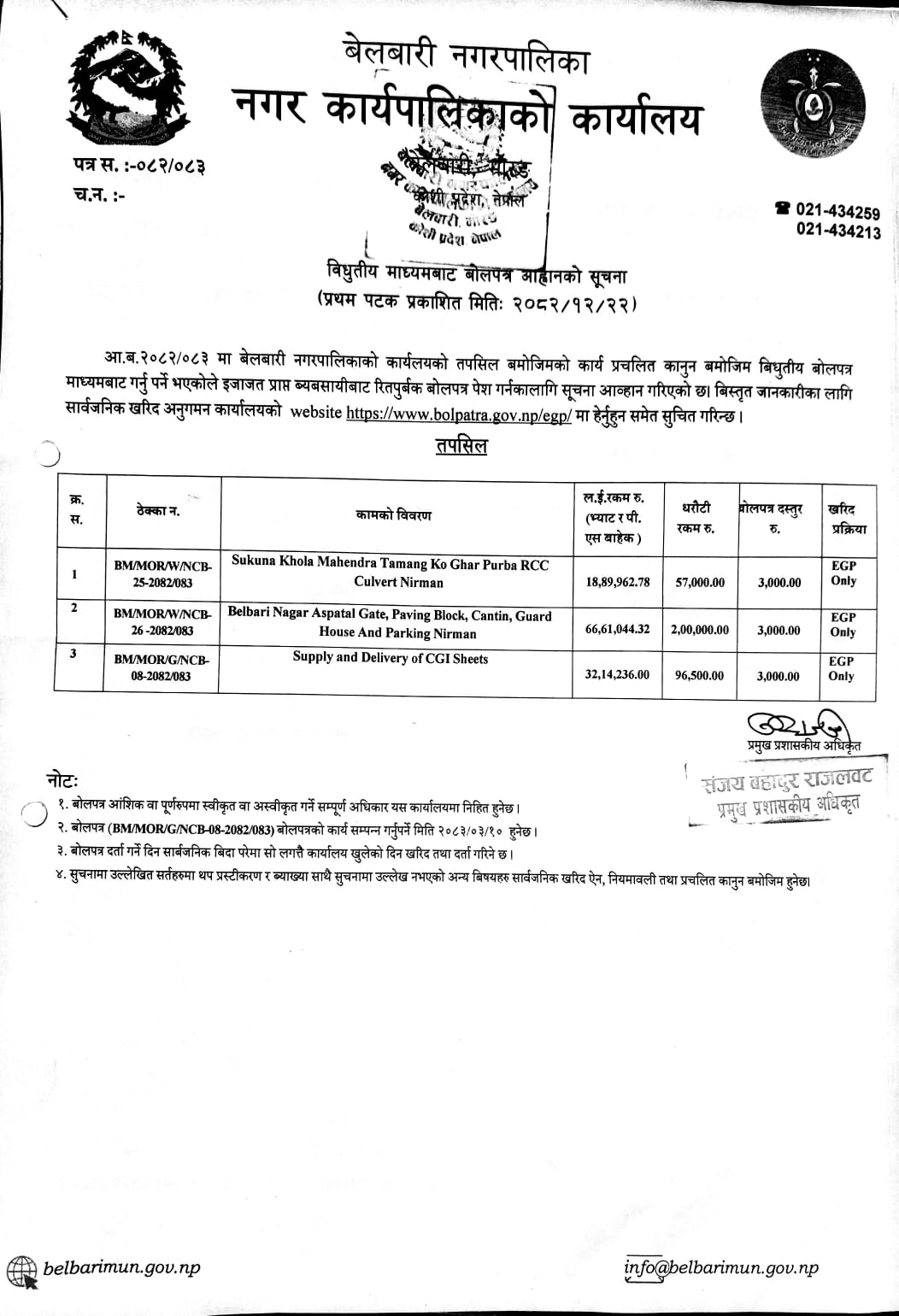 » विद्युतिय माध्यमबाट बोलपत्र आव्हानको सूचना । मिति २०८२।१२।२२