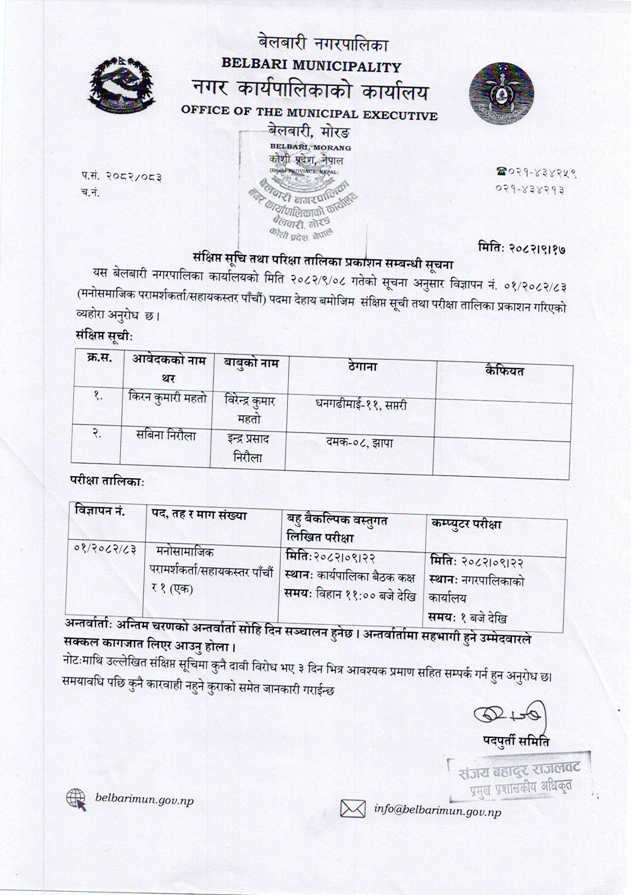 संक्षिप्त सूचि तथा परिक्षा तालिका प्रकाशन सम्बन्धी सूचना ।