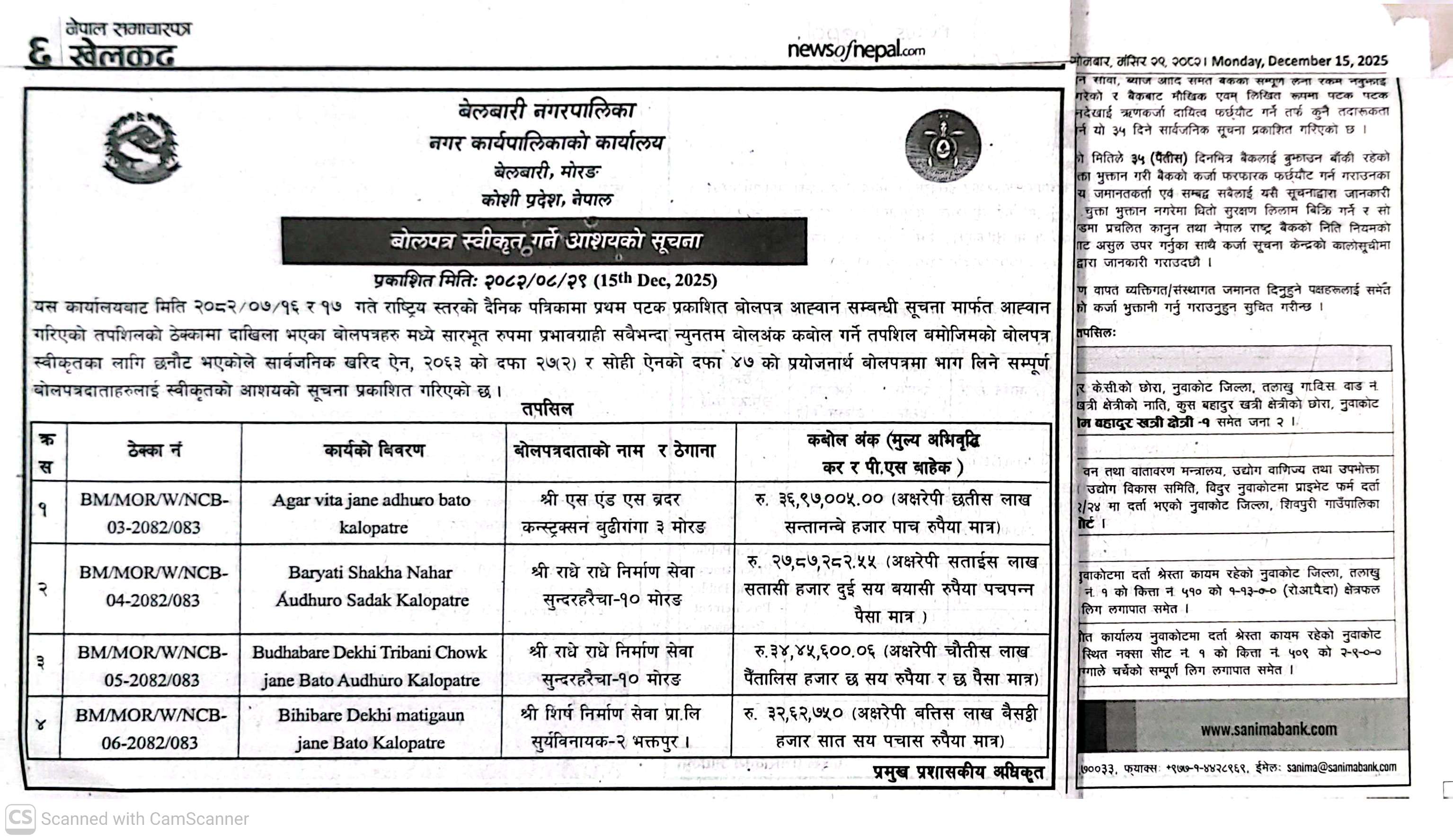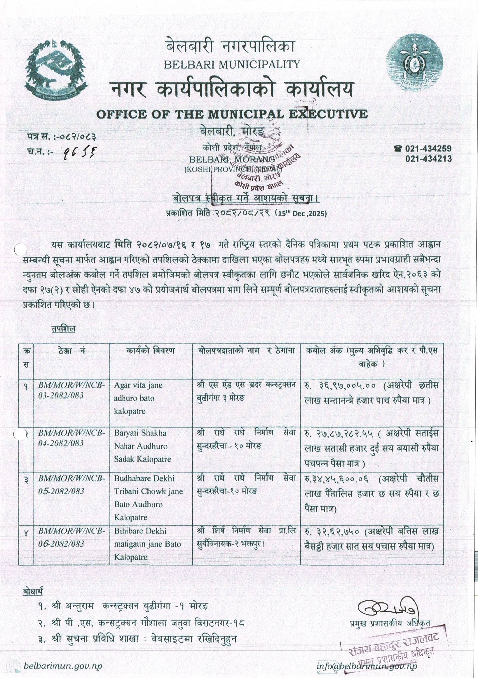 » बोलपत्र स्वीकृत गर्ने आषयको सूचना ।