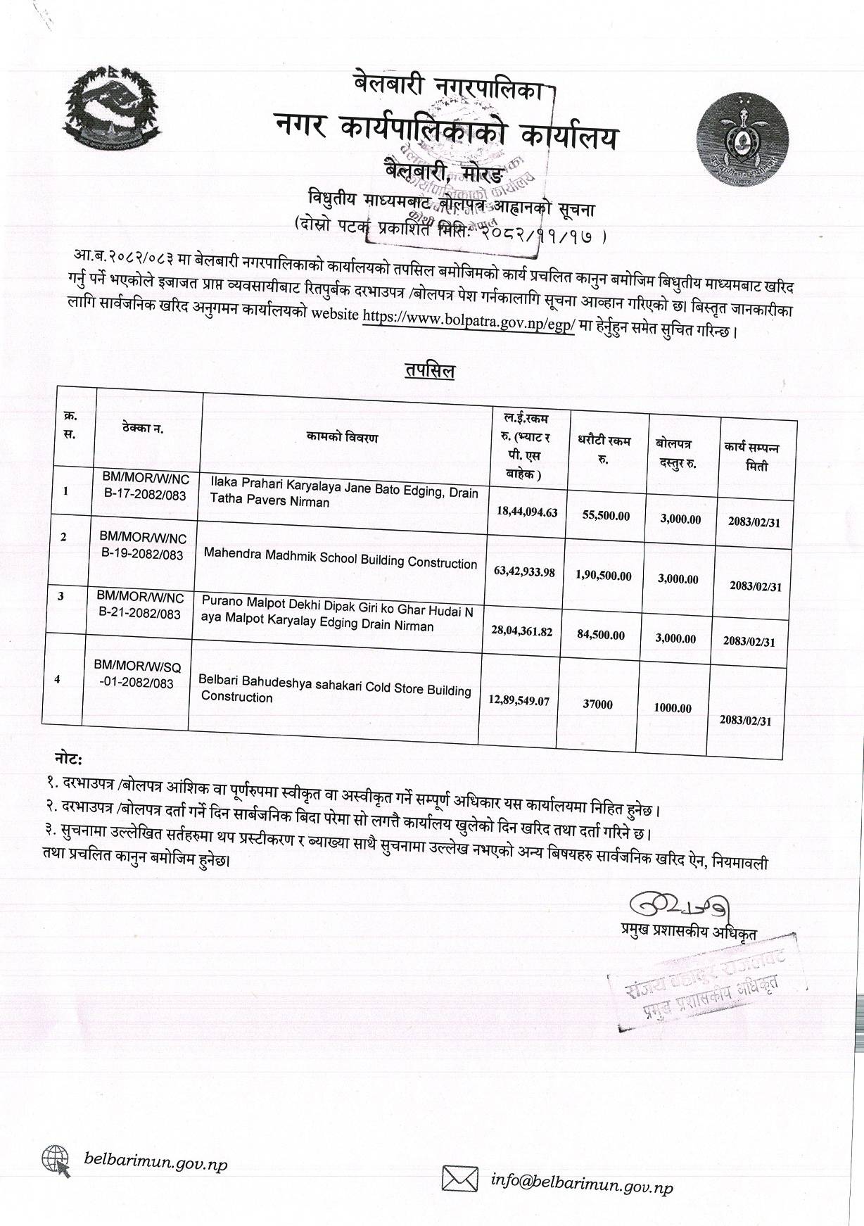 विद्युतिय माध्यमबाट बोलपत्र आव्हानको सूचना । दोस्रो पटक प्रकासन मिति २०८२।११।१७