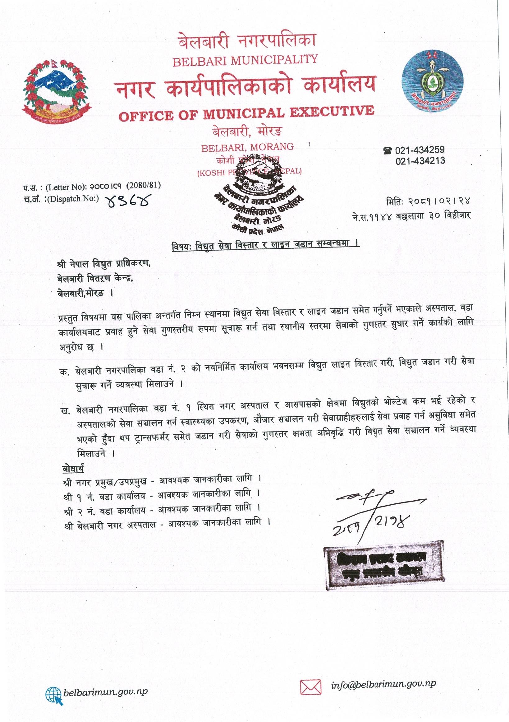 श्री अध्यक्षज्यू वडा कार्यालय सबै बेलबारी नगरपालिका जानकारी सम्बन्धमा ।