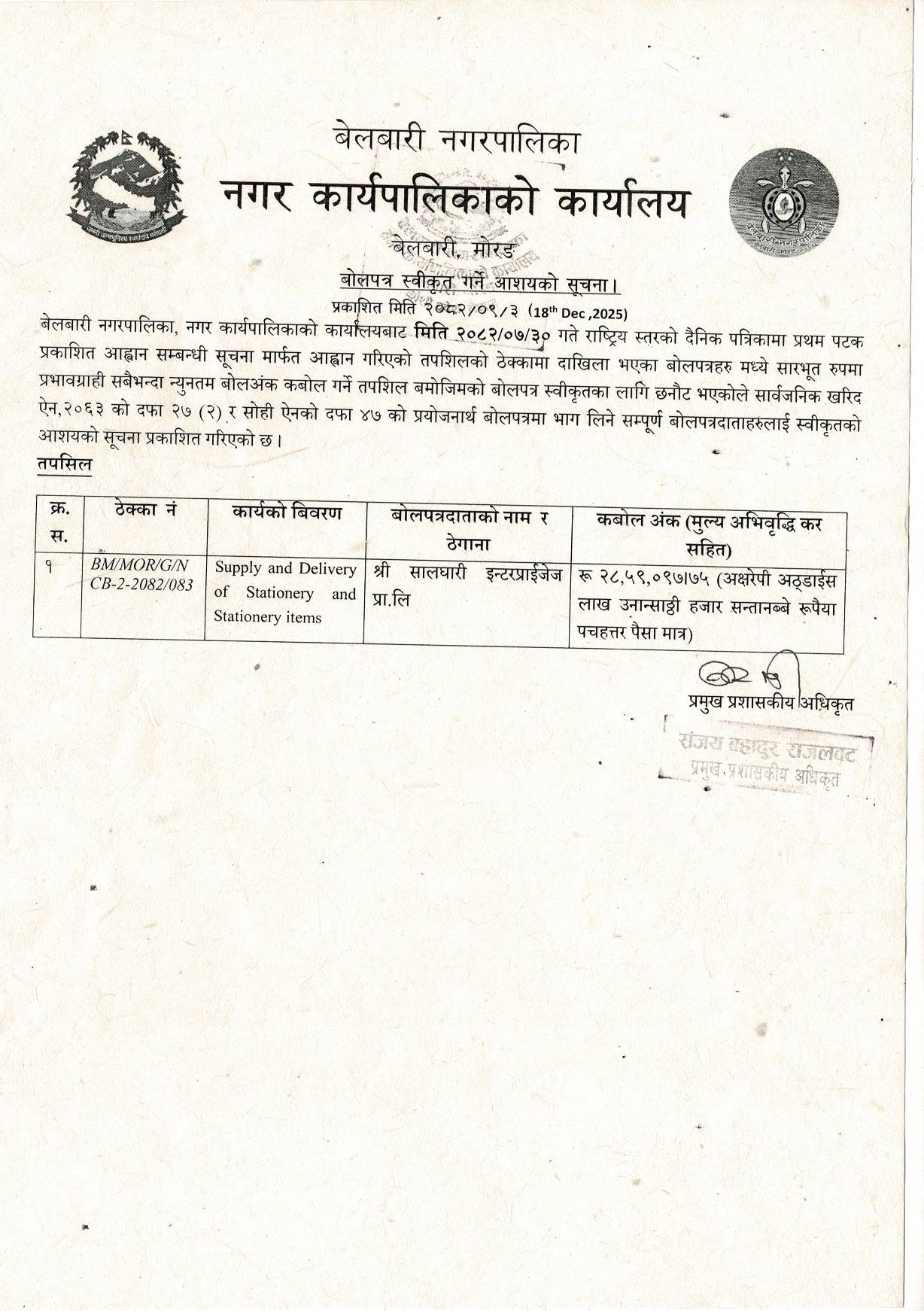 Supply and Delivery of Stationery and Stationery items को बोलपत्र स्वीकृत गर्ने आषयको सूचना ।